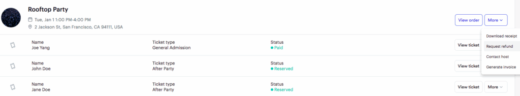 Log-in to your Universe account, go to your Tickets Page and locate the order you would like to request a refund for.